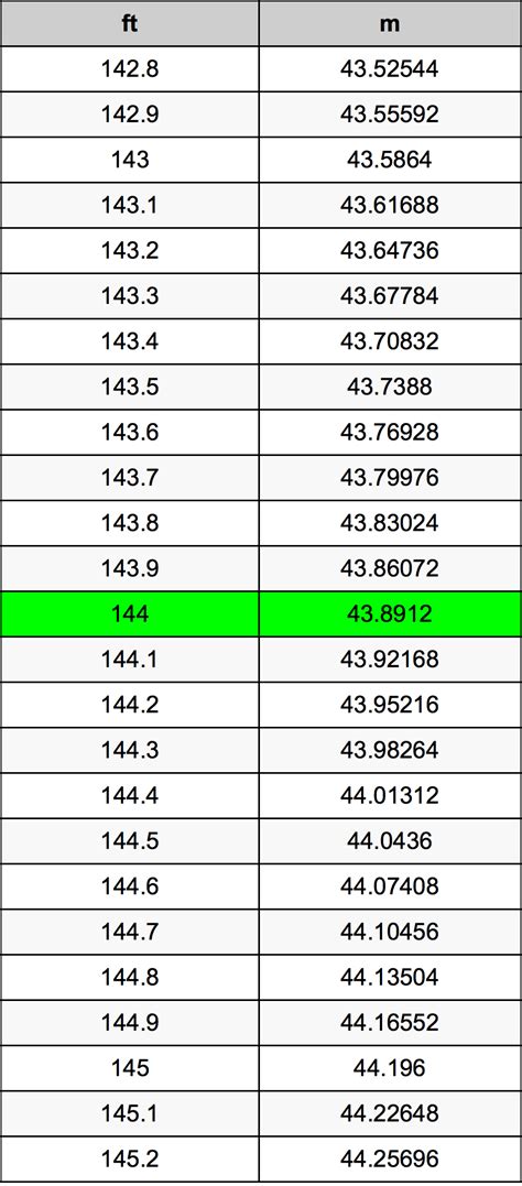 • Using Conversion Charts: Conversion charts provide a quick reference for common conversions. You can find these charts online or in engineering handbooks. Simply look up 144 meters in the chart, and it will give you the corresponding value in feet.