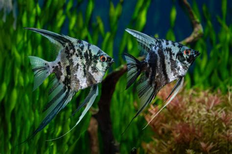 Marble angelfish feature a striking marbled pattern of black, white, and grey. Their unique markings make them a popular choice among aquarists.