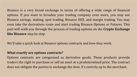 So, what exactly are Binance options ? Simply put, they are contracts that give you the right , but not the obligation, to buy or sell a certain amount of a cryptocurrency at a specific price (called the strike price) on or before a specific date (the expiration date). There are two main types: call options and put options. A call option gives you the right to buy the underlying asset, while a put option gives you the right to sell it.