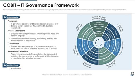 Let’s get into the nitty-gritty. COBIT offers a structured approach to IT governance, covering everything from planning and building IT systems to running and monitoring them. It provides a set of processes, each with its own set of control objectives, designed to help organizations manage their IT resources more effectively. Think of these processes as detailed instructions, making sure everything runs smoothly. The framework is flexible too, adaptable to different organizational sizes, structures, and industries. Whether you are running a small startup or a multinational corporation, COBIT can be tailored to fit your specific needs.
