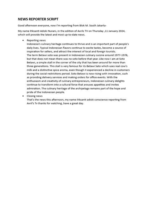 Now that we know what a news report script is, let’s break down the essential parts that make it tick. Think of these as the building blocks you’ll need to assemble your story. A well-structured script typically includes a clear introduction, the body of the report, and a strong conclusion. Each of these sections plays a vital role in guiding the audience through the story. The introduction is your hook; it’s where you grab the viewer’s attention and tell them what the story is about. This is often where you’ll see the most important information presented upfront, a technique known as the “inverted pyramid” in journalism. It’s designed to give the audience the main points immediately, in case they can’t watch the whole report. Following the introduction, we have the body of the report . This is where you flesh out the details. You’ll present the facts, evidence, quotes from sources, and any necessary background information. This section needs to be organized logically, building upon the initial hook and providing a comprehensive understanding of the event or issue. It’s important to maintain a narrative flow here, connecting the different pieces of information smoothly. Think about how you want to present the information – chronologically, thematically, or perhaps by highlighting different perspectives. The body is where the depth of your reporting comes to life. You might include soundbites from interviews, which add a human element and credibility to your report. These clips should be carefully selected to support your narrative and offer insights from those directly involved or knowledgeable about the topic. Then, we have the conclusion . This is your wrap-up. It’s where you summarize the key takeaways and often leave the audience with a final thought or a look ahead. Sometimes, the conclusion might reiterate the main point or mention what happens next. It’s the final impression you leave, so it needs to be impactful and clear. Beyond these main structural components, you’ll also find specific elements within a script that are crucial for production. These include visual cues , which tell the camera operator what to shoot or what graphics to display. For television news, these are absolutely essential. You’ll also have audio cues for music, sound effects, or specific soundbites. Reporter’s narration is the actual text the reporter will read, and interview clips (or “bites”) are pre-recorded segments of interviews that are woven into the report. Finally, there’s often a sign-off , where the reporter identifies themselves and their location. Understanding these components is crucial for both writing and producing a professional news report. It ensures that everyone involved in the production process – from the writer to the editor to the on-air talent – is on the same page. It’s about creating a cohesive package where the visuals, audio, and narration all work together seamlessly to tell the story effectively. So, mastering these elements will set you up for success in crafting a compelling news report script that keeps your audience engaged from start to finish.**