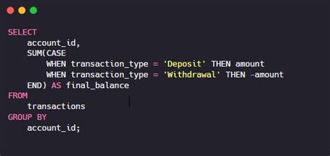 • Aggregations: Calculate summary statistics using functions like SUM , AVG , COUNT , MIN , and MAX .