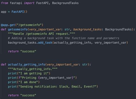 So, what exactly are FastAPI background tasks , you ask? In a nutshell, they are functions that run after your API has already sent a response back to the client. Imagine a user making a request to your API. Normally, your API would process the request, do all the necessary work, and then send back a confirmation. If that work takes a long time, the user is just staring at a loading spinner, which is no fun. With background tasks, your API can quickly send back a confirmation (like “Your request has been received and is being processed”) and then, in the background , it starts the heavy lifting. This means your user gets an almost immediate response, and the potentially time-consuming operation happens asynchronously without blocking the main thread. This is a massive win for user experience and application performance. FastAPI leverages Python’s asyncio capabilities, making it a natural fit for handling these kinds of non-blocking operations. It’s all about making your application feel snappy and responsive, even when it’s juggling a lot of work behind the scenes. We’re talking about freeing up your main request handlers to deal with new incoming requests instead of getting bogged down in lengthy computations or I/O operations. This asynchronous magic is a cornerstone of modern web development, and FastAPI provides a clean, Pythonic way to harness its power. The key takeaway here is that background tasks decouple the user-facing request from the potentially lengthy operations, leading to a much better perceived performance and a more robust application.