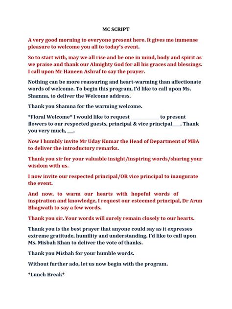 By avoiding these common mistakes, you can ensure that your formal MC script is polished, professional, and engaging. Remember, the goal is to create a memorable and enjoyable experience for everyone in attendance. Take the time to craft a well-written script, practice your delivery, and be mindful of your audience. With a little preparation and attention to detail, you can excel in your role as a formal MC and leave a lasting positive impression.