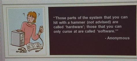 • Your Smartphone: The screen , the battery , the camera lens , the speakers , the processor chip – all hardware . The Android or iOS operating system , the WhatsApp app , the YouTube app , the camera app – all software .