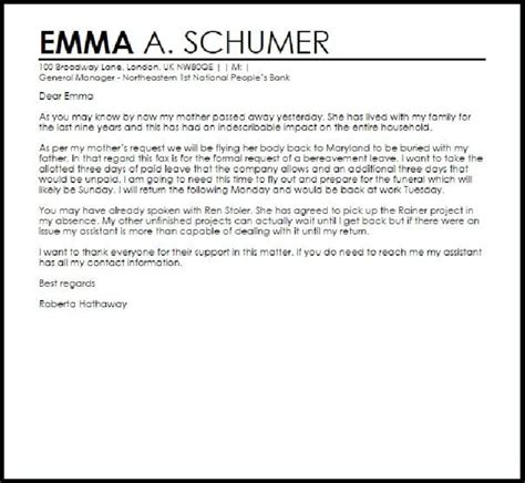 Bereavement leave , also known as compassionate leave , is a period of absence from work granted to an employee following the death of a close family member. The purpose of this leave is to allow the employee time to grieve, attend the funeral, and handle any necessary arrangements. Policies regarding bereavement leave vary widely depending on the company, industry, and location. Some companies offer paid bereavement leave, while others may require employees to use vacation time or unpaid leave. It’s essential to familiarize yourself with your company’s specific policy before submitting your request. Knowing the details will help you frame your letter appropriately and understand your entitlements. Typically, bereavement leave covers immediate family members such as parents, siblings, spouses, and children. However, some companies may also extend it to grandparents, in-laws, and other close relatives. Understanding these nuances is the first step in effectively communicating your needs to your employer. Moreover, be aware that cultural differences can influence bereavement practices; what is standard in one culture may not be in another, so it’s crucial to be respectful and informed.