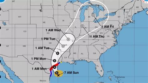 • Time Markers: Points along the path indicating the storm’s projected location at specific times.