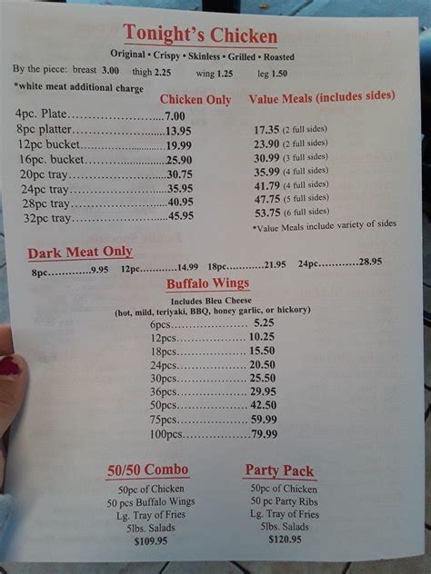 When you explore the combo meals, you’ll typically find options that include a selection of chicken pieces (wings, tenders, etc.), a side dish (fries, coleslaw, etc.), and a drink. The combinations are designed to offer a balanced and satisfying meal. You’ll often have the option to upgrade your sides or drinks for a small additional cost. The family packs, perfect for groups, usually offer a larger quantity of chicken (e.g., a bucket of pieces, tenders, or a combination), multiple sides (large fries, multiple coleslaws), and sometimes a large beverage. Family packs are cost-effective, offering a per-person price that’s usually lower than ordering individually. Keep an eye out for special deals.