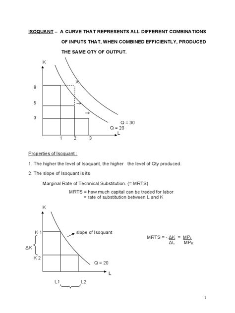 When we talk about the shape and properties of isoquants , we’re really digging into the nuances of how inputs can be substituted in the production process. For starters, you’ll notice that isoquants are typically downward-sloping . Why? Well, it makes intuitive sense, right? If you want to produce the same amount of output, and you decide to use more of one input (like labor), you must use less of the other input (like capital) to compensate. You can’t just keep adding labor without reducing capital and expect to magically produce the same amount of goods, assuming you’re already at an efficient level. This inverse relationship is key to understanding the trade-offs involved. Another crucial characteristic is that isoquants are generally convex to the origin . This means they curve inwards towards the point where the axes meet. This convexity reflects a concept called the diminishing marginal rate of technical substitution (MRTS) . What the heck does that mean? Simply put, as a firm substitutes more and more of one input (say, labor) for another input (say, capital) along a given isoquant, the rate at which it can substitute becomes smaller. Imagine you’re replacing workers with machines. Initially, you might be able to replace a few workers with one machine and maintain your output. However, as you replace more and more workers, you’ll likely find that each additional machine can only replace a smaller number of workers, or you might even need to add back some labor to make the machines fully effective. This diminishing MRTS implies that as you move down along an isoquant (increasing labor and decreasing capital), the slope of the isoquant gets flatter. This curvature is essential because it acknowledges that inputs aren’t perfectly substitutable. Some combinations might be much more efficient than others, and the ease of substitution often decreases as you move further away from the initial input mix. You’ll also rarely see isoquants that intersect each other. If they did, it would imply a contradiction in production levels. An isoquant further from the origin represents a higher level of output. If two isoquants intersected, it would mean that the same combination of inputs could produce two different levels of output, which is logically impossible in a well-defined production function. Finally, isoquants are usually assumed to be downward-sloping and convex , but there are special cases! For example, if labor and capital were perfect substitutes, the isoquant would be a straight line. If they were perfect complements (like needing exactly one driver for every car), the isoquants would be L-shaped. Understanding these shapes and properties helps economists and businesses visualize and analyze the technical possibilities of production, which is the bedrock for making cost-effective decisions.