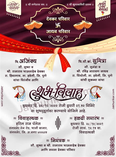 Before we jump into the design and creation, let’s chat about what makes a Marathi wedding invitation special. Marathi wedding invitations , or Lagna Patrikas, are more than just a piece of paper; they are a cherished tradition. They’re a blend of tradition, family values, and a glimpse into the beautiful rituals of a Marathi wedding. These invitations aren’t just about announcing the date and venue; they carry the blessings of elders and a sense of belonging. The language used, the design elements, and the overall feel of the invitation should reflect the essence of Marathi culture and the couple’s unique journey. Traditionally, invitations are often handwritten or meticulously designed to convey respect and warmth. Today, while digital options abound, the core values remain the same. The invitation should reflect the family’s honor, the love shared between the couple, and the joy of the upcoming celebration. The language, typically Marathi, is the soul of the invitation, ensuring that it resonates with the recipients. The design elements often incorporate traditional motifs, colors, and symbols that are significant in Marathi culture. Understanding these elements is key to creating an invitation that truly captures the spirit of a Marathi wedding. The invitation sets the tone for the entire celebration, giving guests a taste of the traditions and joyful atmosphere they can expect. Think of it as the opening act to your wedding extravaganza! When you create your invitation, keep in mind the values it should embody: respect, tradition, and the happiness of the couple. This understanding will guide your design choices, ensuring that your invitation is not just beautiful, but also meaningful. Remember, the invitation is a treasured keepsake, a symbol of the beginning of your new life together, and a beautiful introduction to your wedding day.