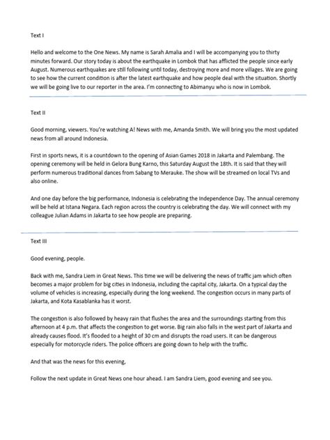 To illustrate the principles of effective news anchor text, let’s examine a few real-world examples. Consider this lead for a story about a local business opening: “A new bakery is bringing sweetness to downtown, creating jobs and delighting taste buds.” This lead is concise, engaging, and informative, immediately capturing the audience’s attention. Here’s an example of how to present background information: “The bakery, called ‘Sweet Surrender,’ is the brainchild of local entrepreneur Sarah Miller, who spent years perfecting her recipes at home.” This provides context and adds a personal touch to the story. To demonstrate the use of vivid language, consider this description of a weather event: “A powerful storm lashed the coast, unleashing torrential rain and hurricane-force winds that left a trail of destruction in its wake.” This paints a vivid picture in the audience’s minds, making the story more impactful. Here’s an example of how to incorporate a sound bite: “‘We’re committed to providing the highest quality baked goods and creating a welcoming atmosphere for our customers,’ said Sarah Miller in an interview.” This adds credibility and authenticity to the story. Finally, here’s an example of a strong conclusion: “‘Sweet Surrender’ is poised to become a beloved fixture in downtown, bringing joy and economic opportunity to the community.” This summarizes the main points of the story and leaves a lasting impression on the audience. These examples demonstrate how to craft news anchor text that is clear, concise, engaging, and impactful, enhancing your effectiveness as a news presenter.