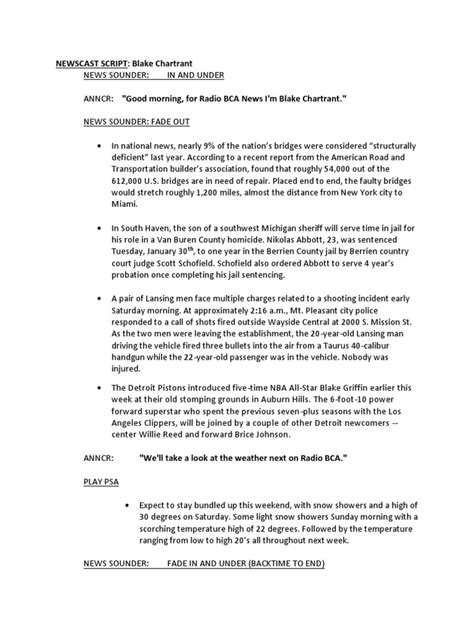 This template is a foundational framework that can be adapted and expanded upon to suit the specific needs and style of any newscast. The key is to use it as a starting point and then tailor it to reflect the unique aspects of each story, the personalities of the anchors, and the overall tone of the news program. For instance, the opening segment can be modified to include a brief summary of the top stories of the day, providing viewers with a comprehensive overview of what’s to come. Similarly, the transitions between segments can be made more engaging by incorporating relevant visuals or sound effects that complement the content being presented. By experimenting with different formats and approaches, aspiring anchors can develop their own signature style and create newscasts that are both informative and entertaining.
