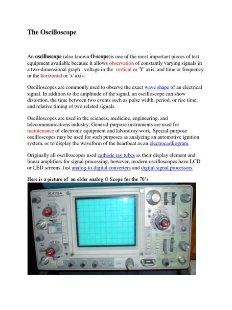 The applications of oscilloscopes are incredibly diverse. In circuit design, they are used to verify that the circuit is behaving as expected, identifying any glitches, noise, or distortions in the signals. In telecommunications, they help analyze the quality of transmitted signals, ensuring reliable communication. In automotive engineering, they can be used to diagnose engine problems by examining the waveforms generated by various sensors. In medical equipment, they play a crucial role in monitoring vital signs such as heart rate and brain activity. Furthermore, oscilloscopes are essential tools in research and development, allowing scientists and engineers to explore new technologies and push the boundaries of innovation. The versatility and power of the oscilloscope make it an indispensable asset for anyone working with electronics.