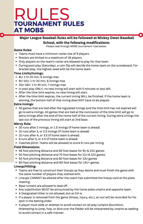 Now, let’s talk about the rules of the game. Participating in PSEIIBullpen’s Baseball Tournaments in 2025 means you’ll need to know the specific rules and regulations. While the general rules of baseball apply, each tournament may have its own set of guidelines to ensure fair play and a smooth tournament experience. Before you hit the field, it’s essential to familiarize yourself with the tournament rules. These rules are usually available on the tournament website or provided to team managers before the event. The tournament rules cover various aspects of the game, including game duration, scoring, substitution rules, and tie-breaking procedures. Make sure your team is aware of these rules to avoid any confusion or misunderstandings during the games. Some tournaments may have specific rules regarding pitching restrictions, defensive alignments, or the use of designated hitters. It’s crucial that all players and coaches understand these rules to ensure compliance and avoid penalties. The organizers are committed to maintaining a fair and competitive environment for all participants. They may appoint umpires to enforce the rules and make calls on the field. It’s important to respect the umpires’ decisions and maintain a sportsmanlike attitude throughout the tournament. Tournament rules also often include guidelines for player eligibility, equipment, and field conduct. These rules are in place to ensure player safety and maintain a positive playing environment. Be sure to review the rules with your team before the tournament starts. This will help you avoid any penalties and ensure you’re prepared for the games. The tournament organizers may also provide a pre-tournament meeting or online resources to clarify any questions or concerns about the rules. This is a great opportunity to ask questions and gain a better understanding of the rules. By understanding and adhering to the tournament rules, you can contribute to a successful and enjoyable baseball experience for everyone.