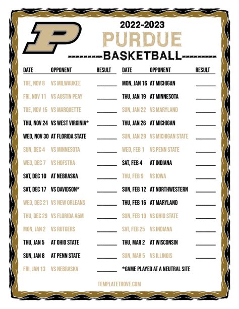 Getting your hands on the printable Purdue basketball schedule is super easy. Usually, the official Purdue Athletics website is the best place to start. They typically release the schedule in PDF format, which you can then download and print. Just head over to their basketball page and look for the schedule link. If you’re having trouble finding it, a quick Google search for “ Purdue basketball schedule printable PDF” should do the trick. Many sports news websites and Purdue fan blogs will also offer the schedule for download. Once you’ve found the PDF, simply click the download button and save it to your computer. Open the file and hit print. Make sure your printer is connected and has enough ink! For the best results, print the schedule in color on high-quality paper. This will make it easier to read and more visually appealing. Now you’re all set to post it wherever you need it and start planning your basketball season!