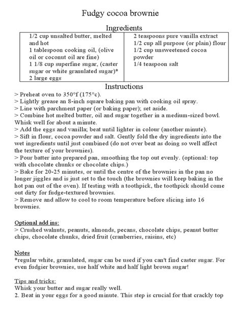 Alright, let’s talk ingredients. The foundation of any great brownie lies in a few key players. First up, chocolate . This is non-negotiable, obviously! You can use unsweetened baking chocolate, semi-sweet chocolate chips, or even a mix. The type and quality of chocolate you use will significantly impact the final flavor and texture. For a deeper, richer flavor, use good quality dark chocolate. If you prefer a sweeter brownie, semi-sweet or milk chocolate might be your jam. Melted chocolate tends to create a fudgier brownie, while cocoa powder can yield a lighter, cakier result. Next, we have butter . Unsalted butter is usually preferred because it gives you control over the salt content. Butter adds richness, moisture, and helps create that glorious texture. Some recipes even call for oil, which can make brownies extra moist. Then there are the eggs . Eggs are crucial for binding everything together, adding richness, and providing structure. The number of eggs can influence the texture; more eggs often lead to a fudgier brownie. And, of course, sugar . Granulated sugar is standard, but brown sugar can add moisture and a slight caramel note. Sugar not only sweetens but also contributes to the texture and the development of that coveted crackly top. Flour is also essential, but less is more when it comes to brownies. Too much flour results in dry, cakey brownies, while the right amount provides just enough structure. All-purpose flour is typically used. Finally, salt and vanilla extract . Salt enhances the chocolate flavor and balances the sweetness. Vanilla extract adds depth and complexity to the overall taste. Some recipes might also include baking powder or baking soda for leavening if a cakier texture is desired, but many classic fudgy brownies rely solely on eggs for their lift. Don’t forget optional additions like walnuts, pecans, or extra chocolate chips – they add wonderful texture and flavor!