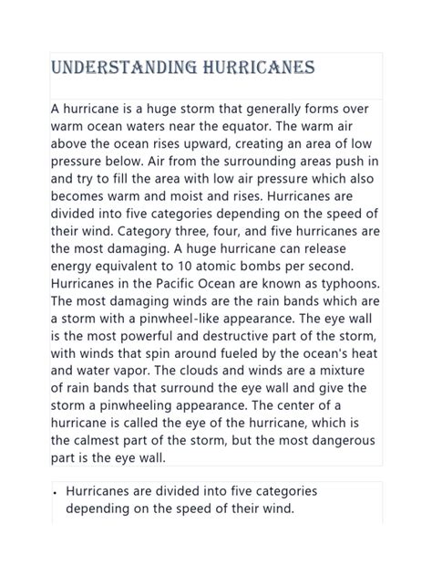 Now that we know how hurricanes form, let’s explore their anatomy. Hurricanes are characterized by several key features. At the center of a hurricane is the eye , a relatively calm region with light winds and often clear skies. The eye is surrounded by the eyewall , a ring of intense thunderstorms that has the strongest winds and the heaviest rainfall. The eyewall is where the most significant damage occurs. Spiral rainbands extend outwards from the eyewall, bringing more rain and wind. These bands can stretch hundreds of miles from the center of the storm. The size of a hurricane can vary. Some are small, only a few hundred miles across, while others can be massive, spanning over 500 miles. Also, hurricane intensity is categorized using the Saffir-Simpson Hurricane Wind Scale . This scale categorizes hurricanes based on their sustained wind speeds. There are five categories, with Category 1 being the weakest and Category 5 being the strongest. Each category represents a different level of potential damage. Keep in mind that as the hurricane moves inland, it can still pose a significant threat, even if the wind speeds decrease. So stay safe!