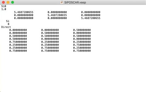 4. Element Symbols/Number of Atoms: The next two lines specify the chemical elements present in the structure and the number of atoms of each element. There are two common formats here. One format lists the chemical symbols of each element (e.g., “Si”, “O”) on one line and the corresponding number of atoms of each element on the next line. The other (more modern) format directly combines the element symbol and count. For example, you might see “Si 2 O 4”, indicating 2 silicon atoms and 4 oxygen atoms. The order is important as it dictates how the atomic positions in the subsequent section are interpreted.