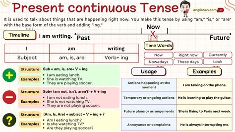 So, there you have it, folks! We’ve taken a deep dive into the present continuous tense , exploring its meaning, how to form it, and crucially, when to use it. Remember, it’s all about capturing actions in progress, temporary situations, and even future plans. It’s the tense that brings your language to life, making it dynamic and immediate. Whether you’re describing what your friends are doing right now, talking about a temporary move, or making plans for the weekend, the present continuous is your best friend. Don’t forget the basic structure: Subject + am/is/are + Verb-ing . And keep those common mistakes, like using it with stative verbs or forgetting ‘to be’, out of your vocabulary. The more you practice, the more natural it will feel. Try describing what’s happening around you right now, or think about your plans for the next few days and express them using this tense. You’ve got this! Happy learning, and keep those sentences flowing!