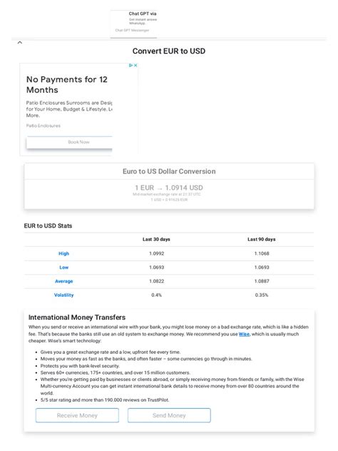 For many people in 2023, online currency exchange services are the go-to for converting USD to EUR. Platforms like Wise (formerly TransferWise), Revolut, Xe.com, and others often offer rates that are much closer to the mid-market rate (the real rate you see on Google or Reuters) than traditional banks. This means you generally get more Euros for your dollars. They usually charge a small, transparent fee, which is often a percentage of the amount you’re sending. The process is typically super straightforward: you create an account, link your bank account, specify the amount you want to convert, and the service handles the rest. Transfers can be relatively quick, often within a business day or two, depending on the service and the countries involved. The main perk here is cost-effectiveness and convenience . You can do it all from your phone or computer, anytime, anywhere. However, it’s crucial to do your research. Compare fees and rates across different platforms before committing. Some might have daily or transaction limits, and you’ll need to ensure the service is reputable and secure. Always check reviews and their regulatory standing. For larger amounts, the savings can be substantial compared to other methods. So, if you’re looking for a good balance of rate, speed, and ease of use, online services are definitely worth exploring.